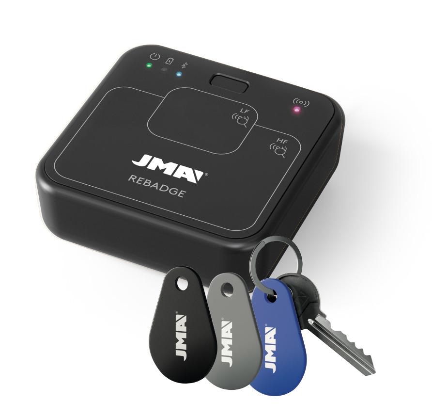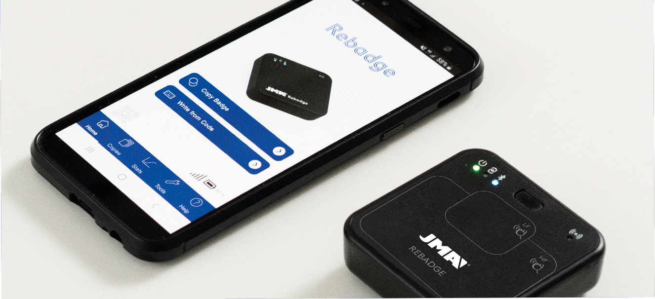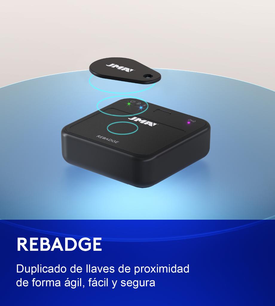 REBADGE es el nuevo dispositivo electrónico de JMA para la duplicación de llaves de proximidad. Innovación digital para un copiado fácil, rápido e intuitivo, guiado por su App móvil JMARebadgePro.
